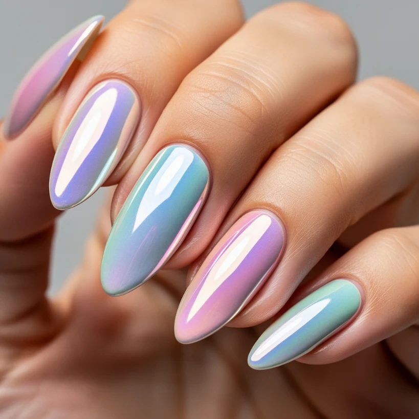 Chrome nails meet pastel tones for a dreamy yet futuristic manicure trend in 2026. The metallic sheen layered over soft colors creates a unique balance between bold and delicate. This design instantly elevates your nails with a high-shine finish.