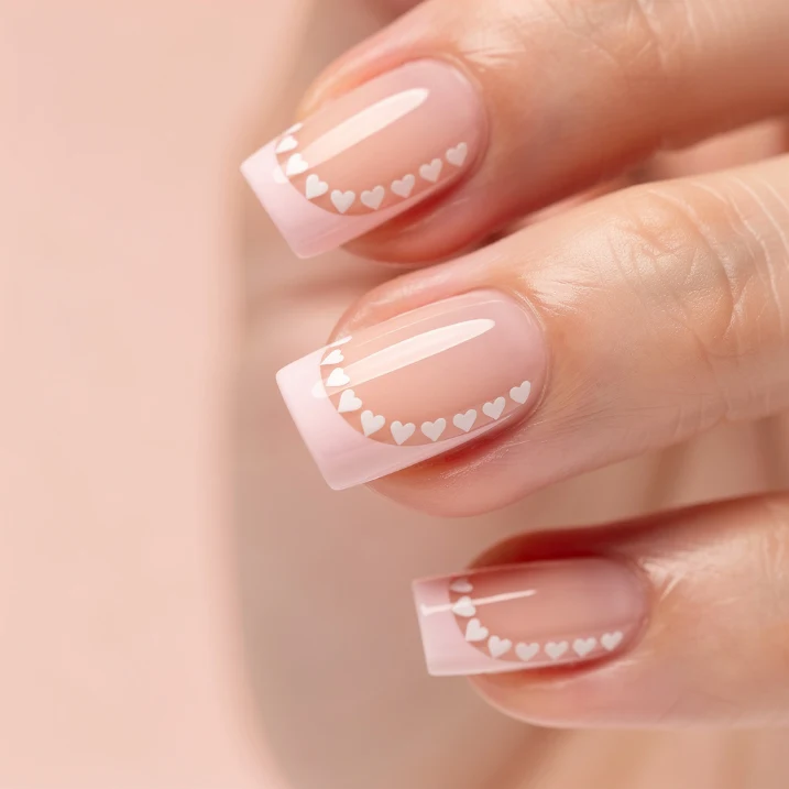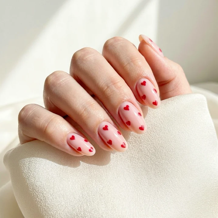 This delicate design is perfect for those who love subtle nail art. Tiny hearts on a nude base create a barely-there romantic vibe.