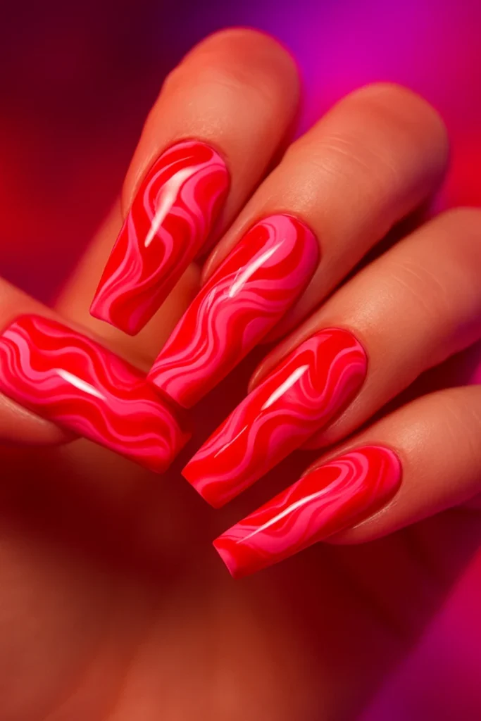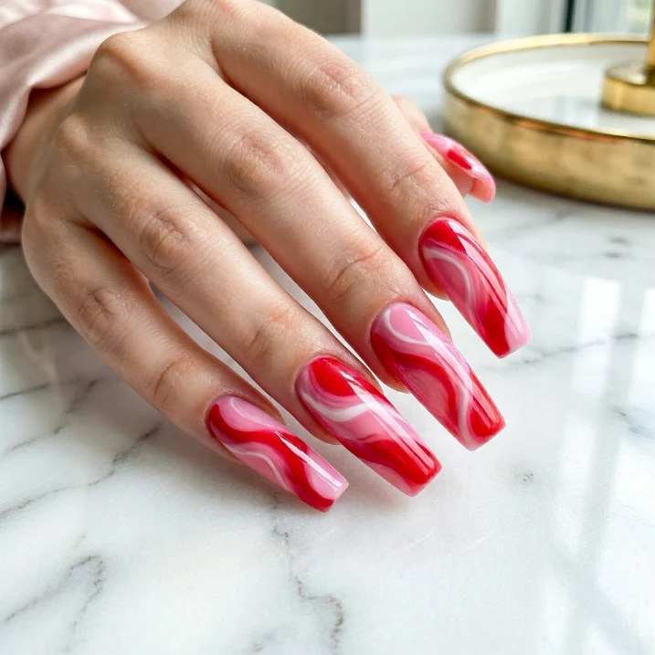 Swirl nails are one of the hottest trends, and combining red and pink makes them perfect for Valentine’s. The abstract design adds a modern artistic touch.