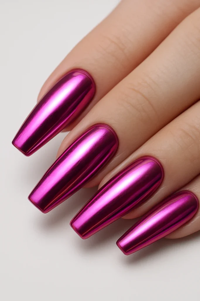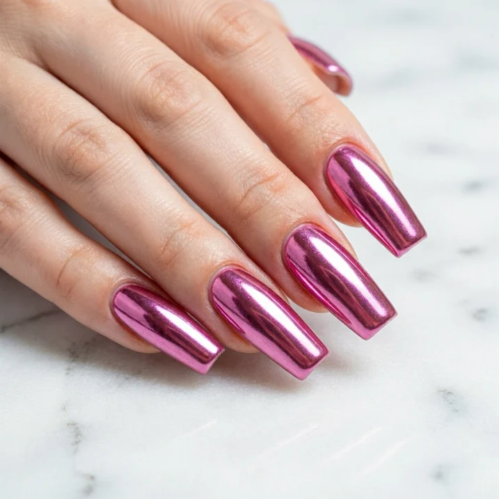 Chrome nails continue to dominate trends, and pink chrome is perfect for Valentine’s. The reflective finish gives a futuristic and glamorous vibe while staying within the romantic color palette.