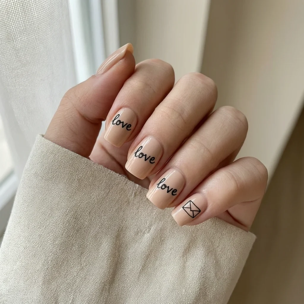 Script nails featuring handwritten “love” add a personalized and artistic touch. The design feels delicate and meaningful.