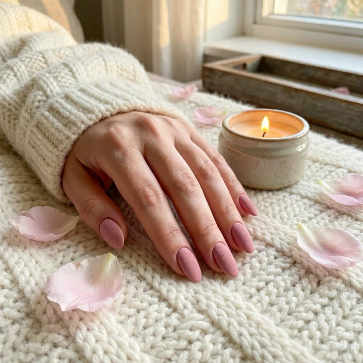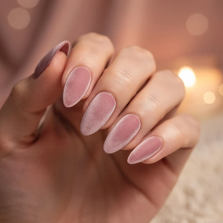 Velvet nails bring a luxurious feel to Valentine’s nail trends. The soft matte texture gives a cozy and elegant vibe that’s perfect for winter romance.