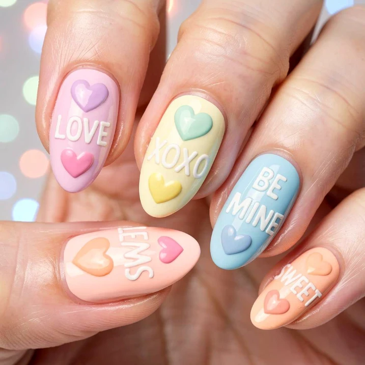 Inspired by classic Valentine candies, this playful design is fun and nostalgic. Each nail features pastel colors with cute messages.