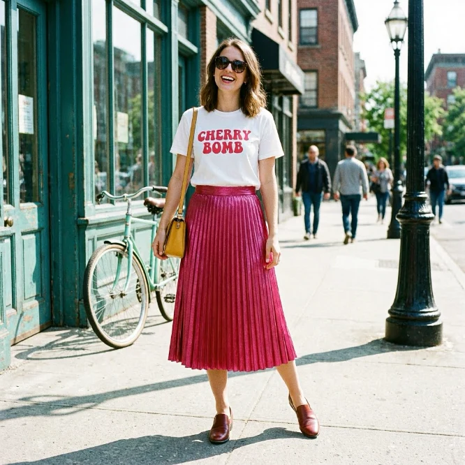 Combining a graphic tee with a skirt creates a fun mix of casual and feminine styles. This outfit allows you to express your personality while staying comfortable. The contrast between the relaxed tee and the structured skirt makes the look unique.