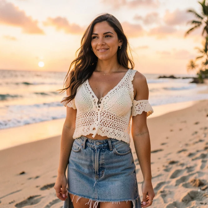 Crochet tops bring a bohemian vibe to summer outfits. When paired with a denim skirt, the look becomes trendy and playful. The textured fabric adds interest while keeping the outfit breathable and stylish.