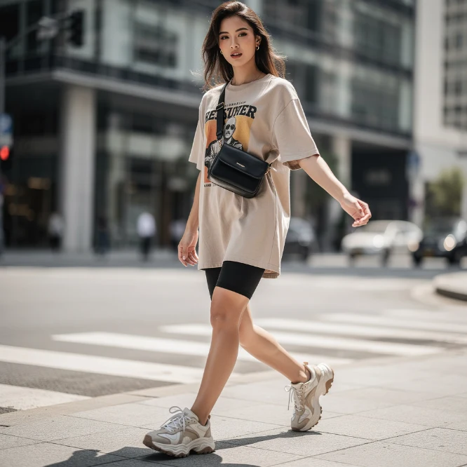 Biker shorts paired with an oversized tee create a trendy and comfortable summer outfit that blends style with ease. This look is perfect for days when you want to stay cool but still look effortlessly fashionable. The loose fit of the shirt balances the fitted shorts, creating a flattering and modern silhouette.