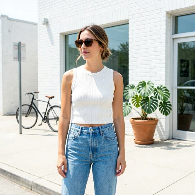 Denim shorts and a tank top create a classic summer outfit that never fails. This combination is simple yet stylish, allowing you to stay cool during hot days. The fitted tank balances the casual look of the shorts, creating a flattering and easygoing vibe.