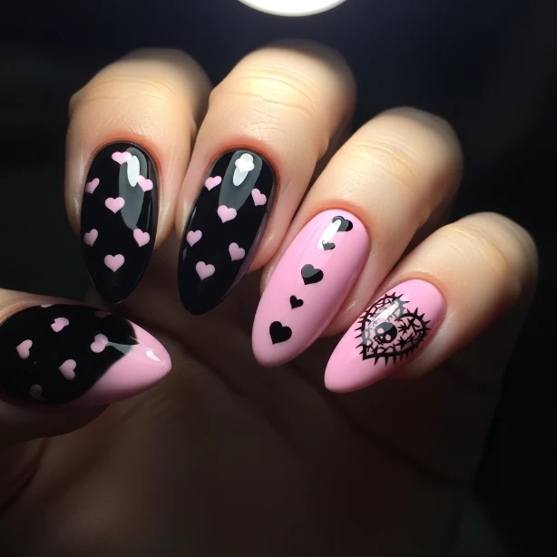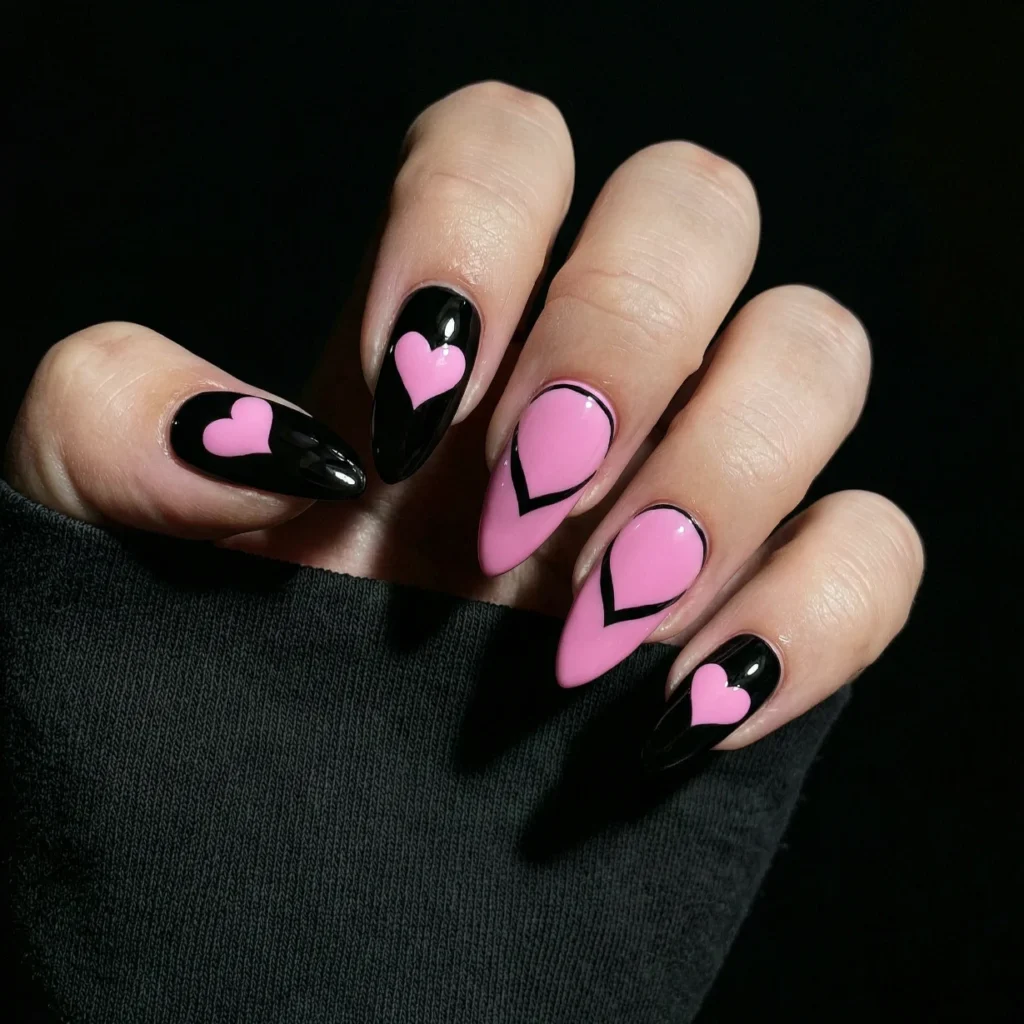 Black and pink nails create a bold contrast that feels edgy yet romantic. Adding heart details softens the look, making it perfect for February.
