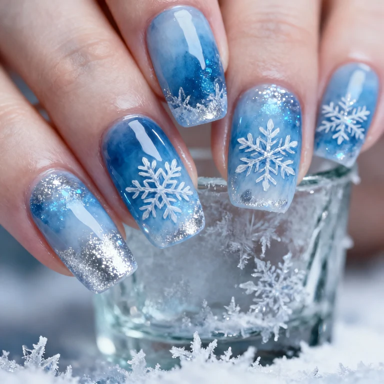 Icy blue nails capture the essence of winter with their cool, frosty tones. Adding shimmer or glitter creates a snow-like sparkle that feels magical and fresh. Snowflake designs can enhance the theme, making your nails look like a winter wonderland.