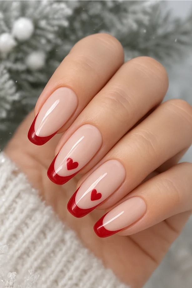 Heart accent nails are a simple yet adorable way to celebrate February. A nude or soft pink base paired with tiny red or white hearts creates a minimal yet charming design. This style is perfect if you prefer something subtle but still festive, making it great for everyday wear throughout the winter season.