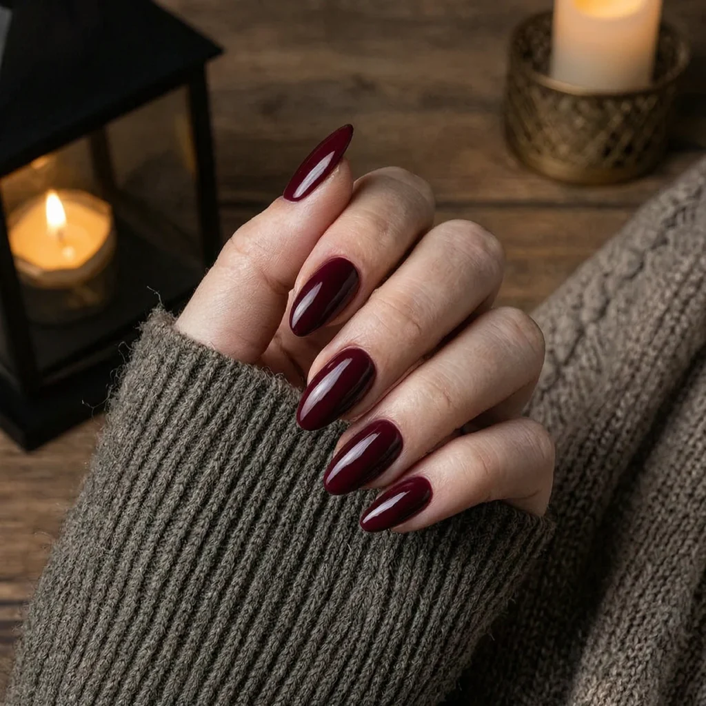 Deep burgundy nails bring a rich and sophisticated vibe to your winter look. This color is perfect for February as it feels romantic yet bold. The glossy finish enhances the depth of the shade, making it ideal for evening looks.