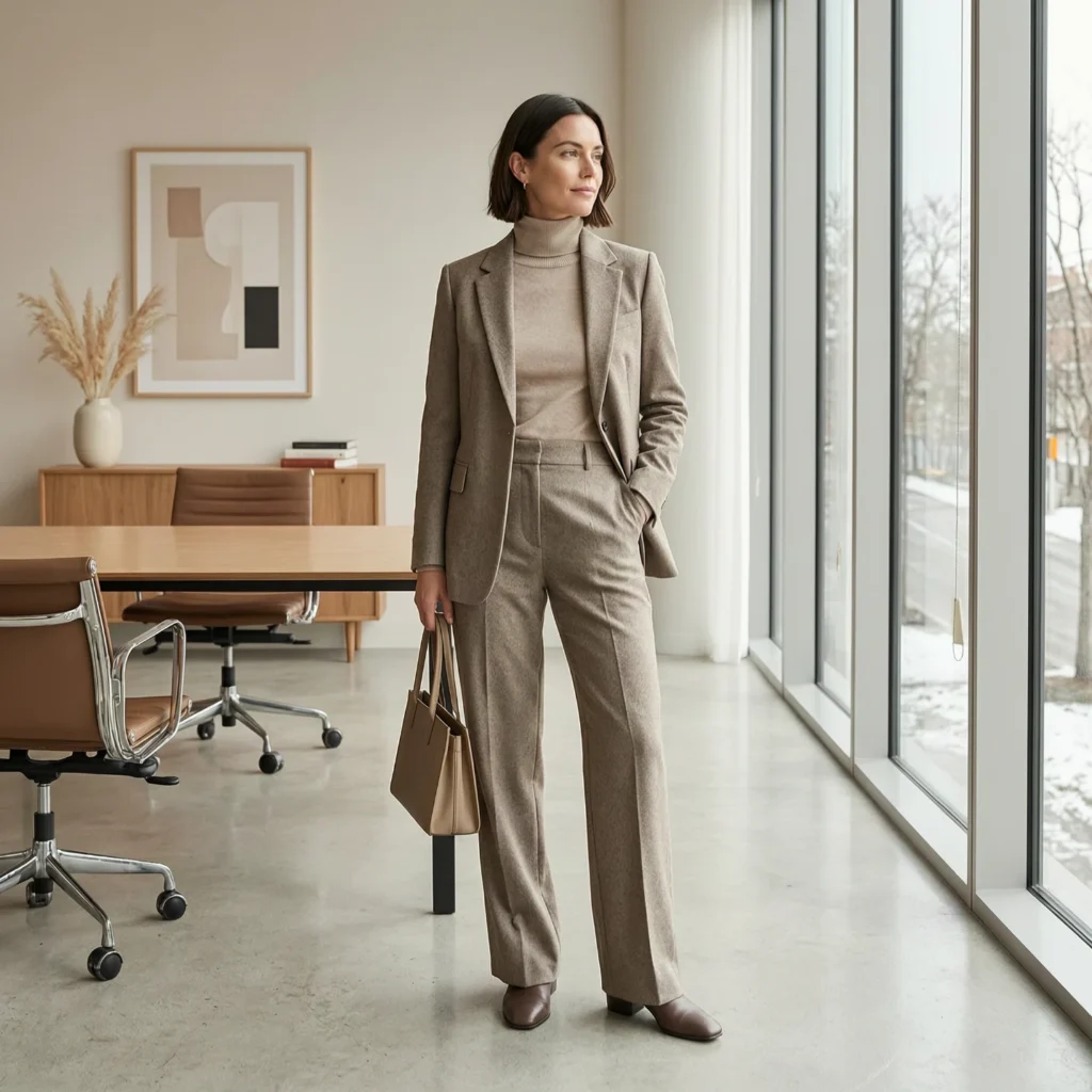 Stick to neutral shades like gray, beige, or navy for a professional finish. Keep accessories simple to maintain the strong visual impact. This outfit works especially well for leadership roles or competitive industries where standing out is important.