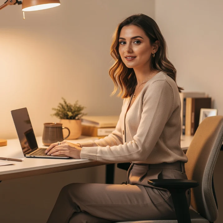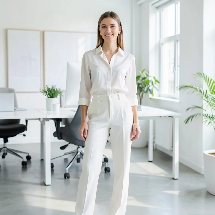 Choose soft colors like pastel pink, ivory, or light blue to create a welcoming appearance. High-waisted trousers elongate the body and create a flattering silhouette. This look is both stylish and professional, helping you feel confident and comfortable.