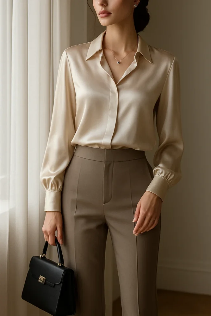 A soft blouse paired with high-waisted trousers creates a balanced and modern interview outfit. The blouse adds femininity, while the trousers keep the look structured and polished. This outfit is ideal for business casual environments.