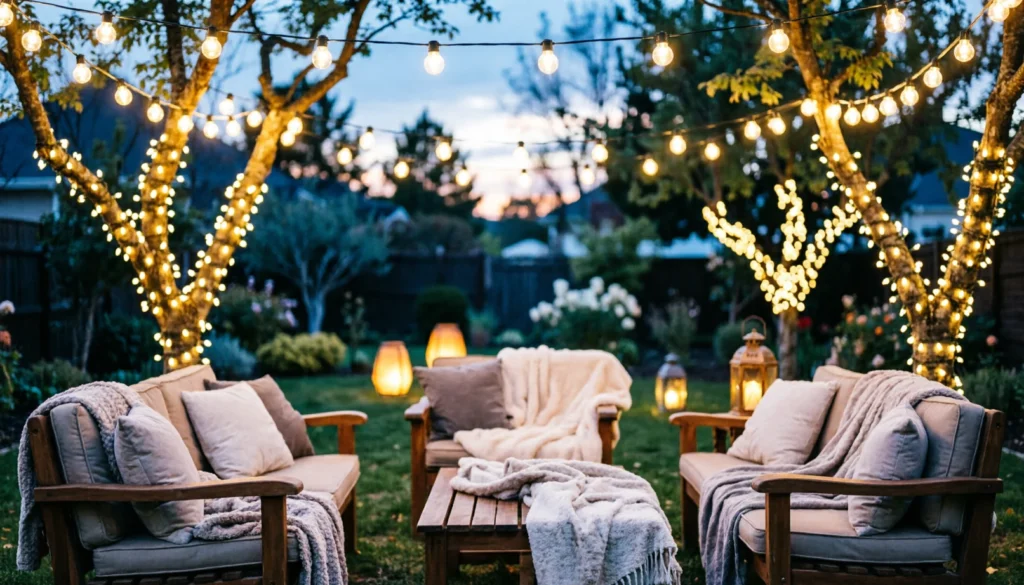 Creating a string light canopy instantly transforms your outdoor space into a magical retreat. Drape warm white lights across trees, fences, or pergolas to create a soft glowing ceiling that feels both intimate and festive. This setup works beautifully for holiday gatherings, adding warmth and charm while making your backyard feel like a cozy escape.