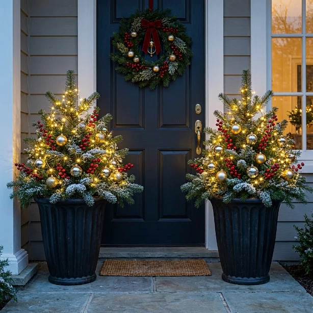 Decorate planters with seasonal greenery and accents like berries, ornaments, and lights. This adds a festive touch to your entryway.