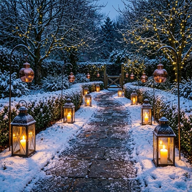 You can enhance the look by adding greenery, pinecones, or faux snow around the base of the lanterns. The soft lighting guides guests while creating a warm and inviting holiday atmosphere.