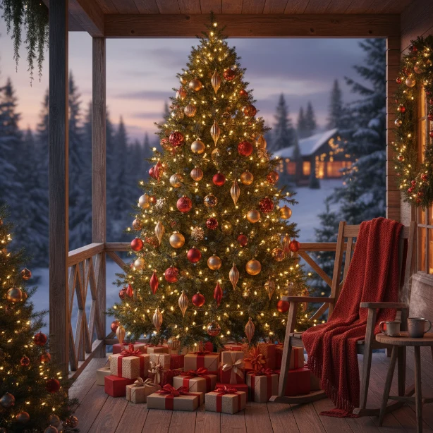 Place wrapped faux gift boxes underneath to complete the look. This setup works perfectly for porches or patios, creating a picture-perfect holiday scene that shines day and night.