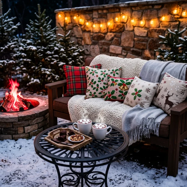 Transform your outdoor seating into a cozy holiday lounge. Add festive pillows, blankets, and throws in seasonal patterns like plaid or knit textures.