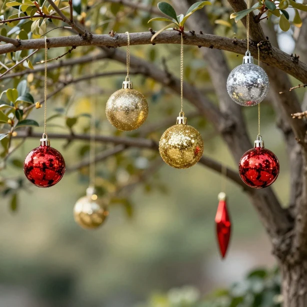 Hanging ornaments from tree branches creates a whimsical outdoor display. Use shatterproof ornaments in coordinating colors for a cohesive look.