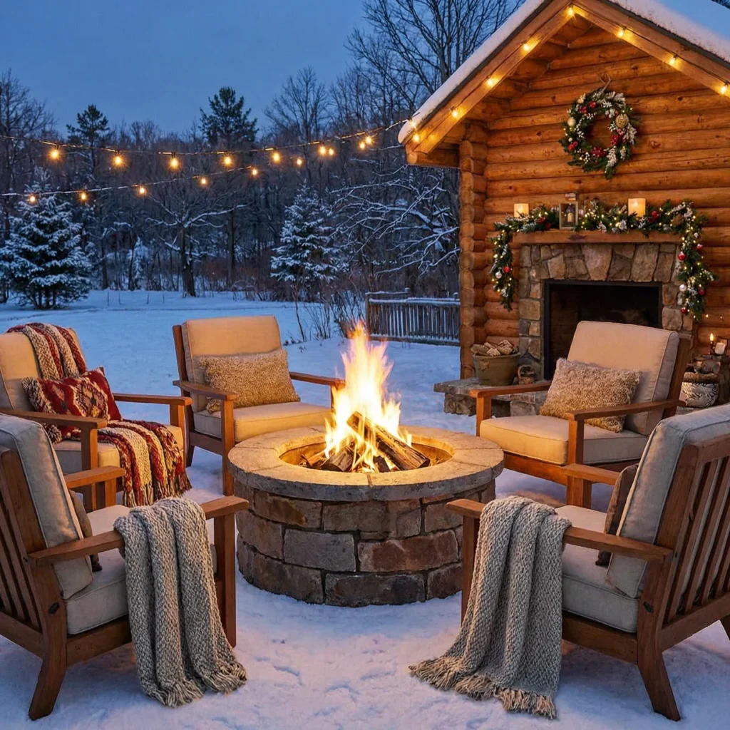 A decorated fire pit area becomes the heart of your outdoor holiday space. Arrange comfortable seating around the fire and add festive accents like cushions and throws.