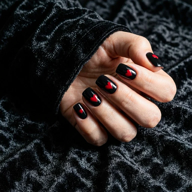 Black and red nails create a bold and edgy Valentine’s look. The dark base adds drama, while red details keep the romantic theme alive.