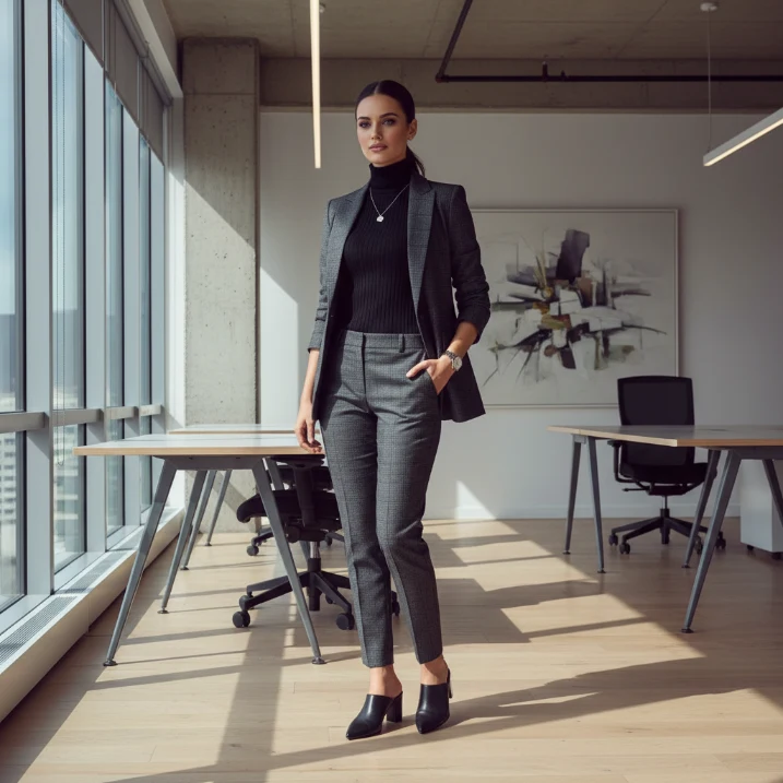 A turtleneck layered under a blazer creates a sleek and sophisticated business casual outfit. This combination is perfect for colder seasons while maintaining a sharp and professional appearance. The fitted turtleneck balances the structured blazer beautifully, resulting in a clean silhouette.