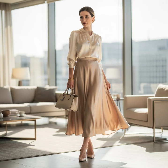 A midi skirt combined with a silk blouse creates a feminine yet professional business casual outfit. The flowing fabric of the skirt adds movement and grace, while the silk blouse gives a soft, luxurious finish. This combination is perfect for office environments where you want to look elegant without appearing too formal or rigid.