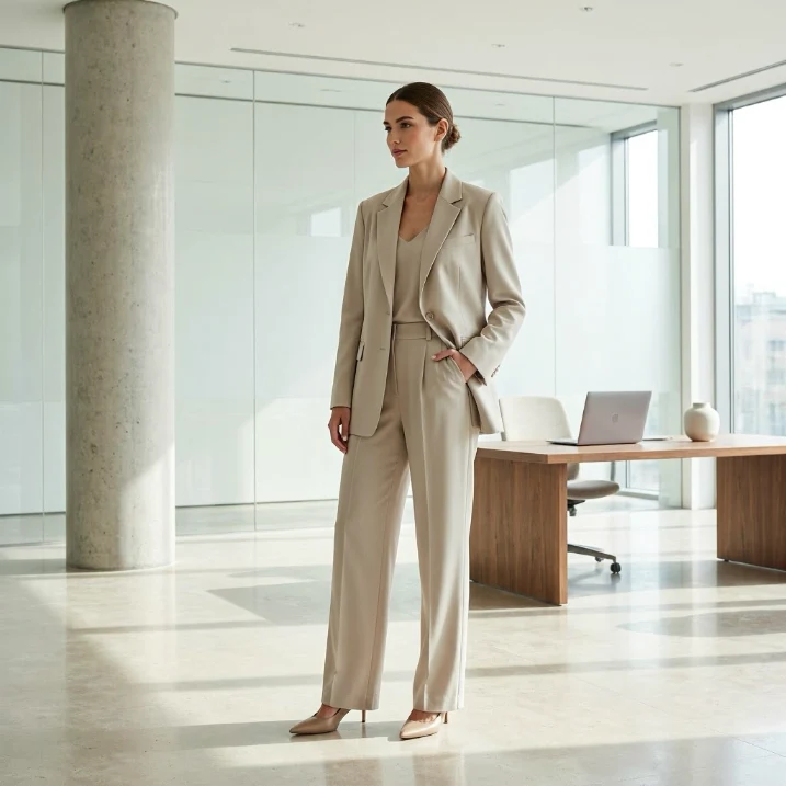 A monochrome beige outfit delivers a strong, cohesive, and sophisticated business casual look. Wearing the same color family from top to bottom elongates the body visually, creating a sleek and powerful silhouette. The matching blazer and trousers give a structured feel while maintaining softness through neutral tones.