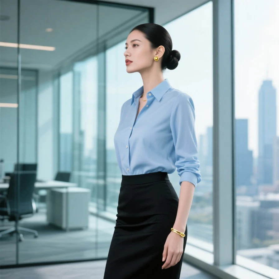 The pencil skirt and button-up shirt combination is a timeless business casual outfit that emphasizes structure and professionalism. The fitted skirt highlights a clean silhouette, while the button-up shirt adds sharpness and clarity to the overall look, making it ideal for formal office environments.