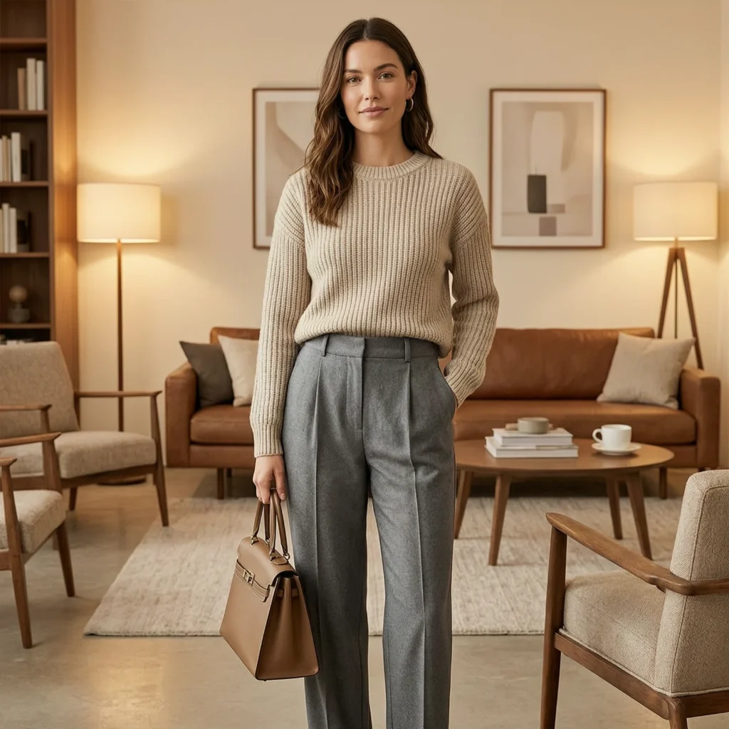 A knit sweater paired with tailored trousers creates the perfect balance between comfort and professionalism. The soft texture of the sweater brings warmth, while the structured pants maintain a polished and office-appropriate appearance. This outfit is ideal for cooler seasons when layering becomes essential.