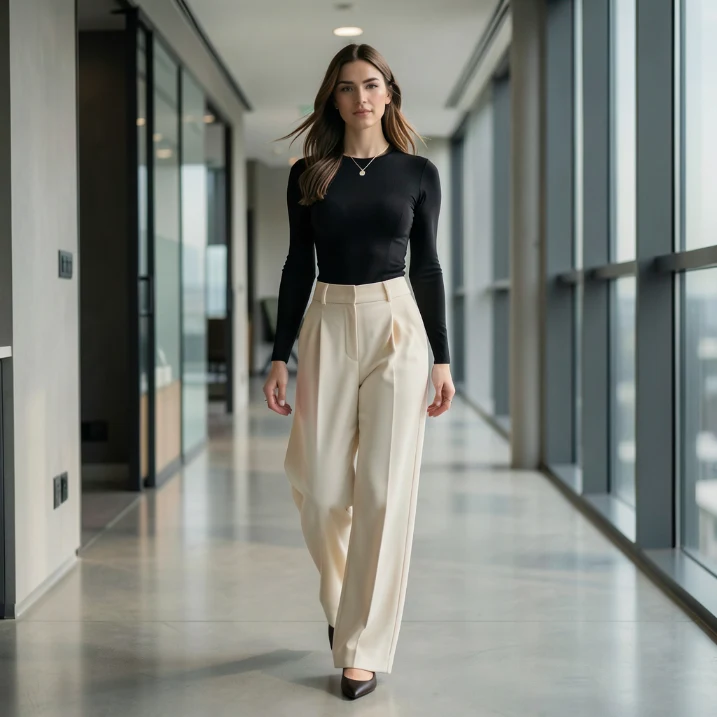 To elevate the outfit, choose high-waisted trousers in neutral shades like beige, black, or white. Add pointed heels or sleek loafers for a sophisticated touch. A structured handbag and simple accessories ensure the outfit remains polished, modern, and effortlessly professional.
