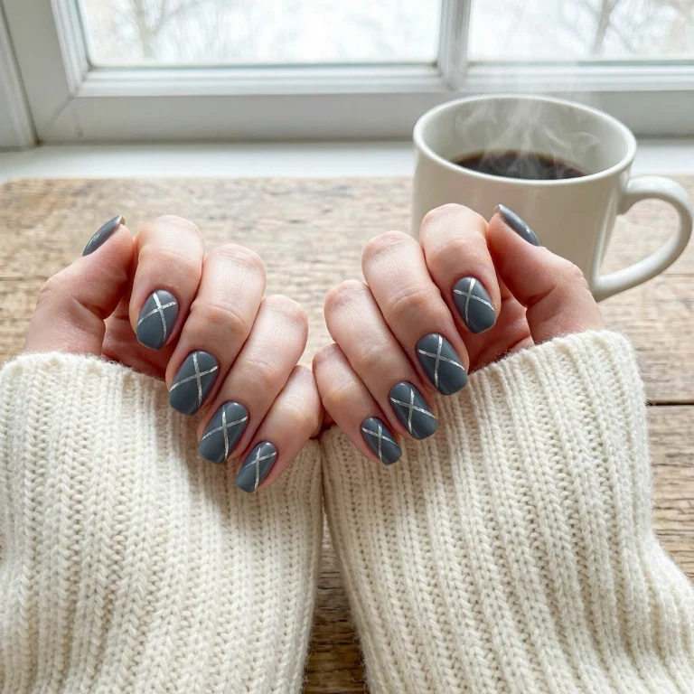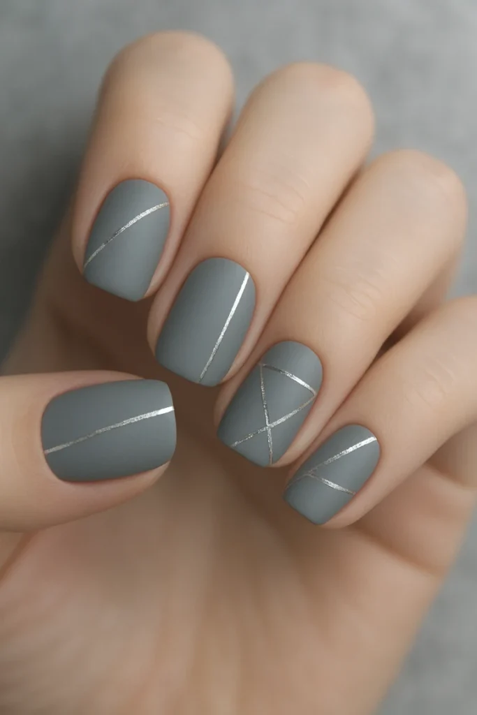 Soft grey nails combined with delicate silver lines create a sleek winter look. The muted tone feels cozy and modern, while metallic accents add just enough sparkle. This design is perfect for a subtle holiday glam effect.