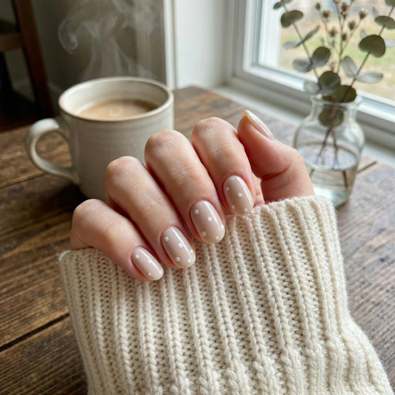 Small white dots on a beige base mimic falling snow in a subtle way. This design is simple, cute, and perfect for the holiday season. It’s easy to achieve and looks effortlessly stylish.