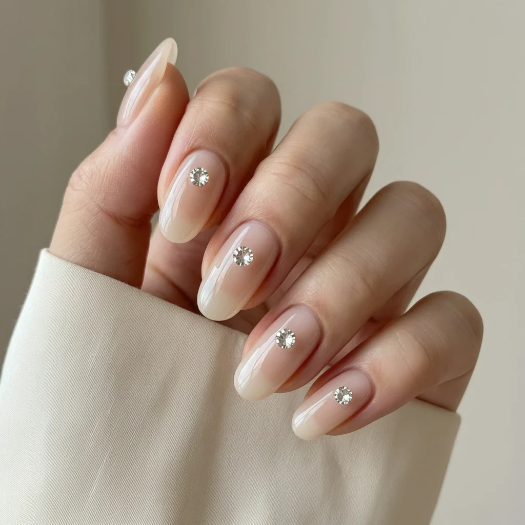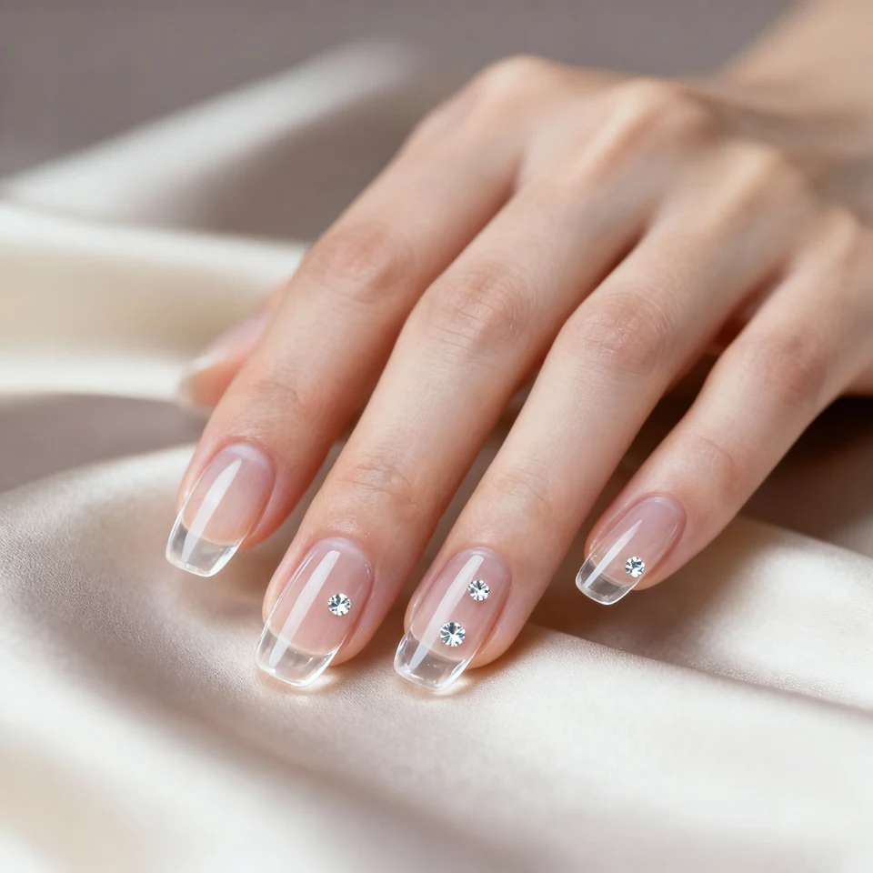 Clear nails with tiny gems create a chic and barely-there look. The gems add a hint of sparkle without overwhelming the design. This is perfect for a modern minimalist holiday manicure.