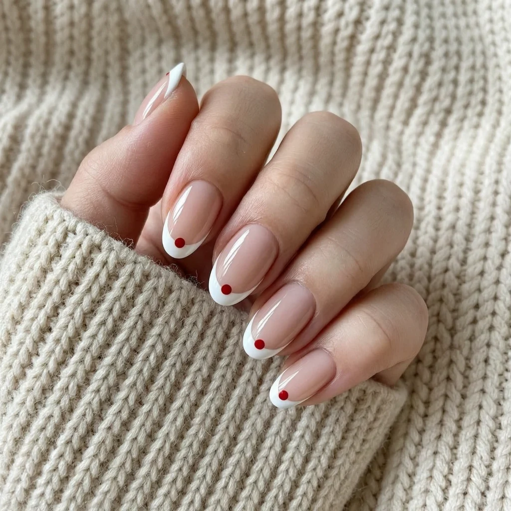 Classic French tips get a festive upgrade with tiny red accents. Keeping the tips thin and crisp maintains a minimalist aesthetic, while small dots or lines add a subtle Christmas feel. This design is perfect for those who love timeless nail styles.
