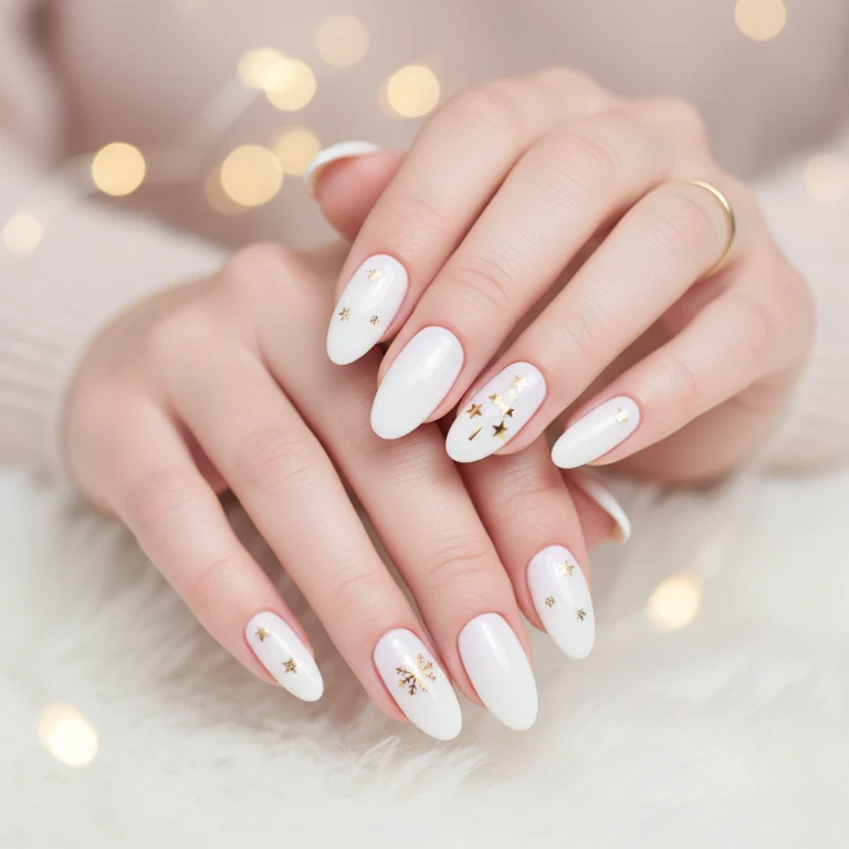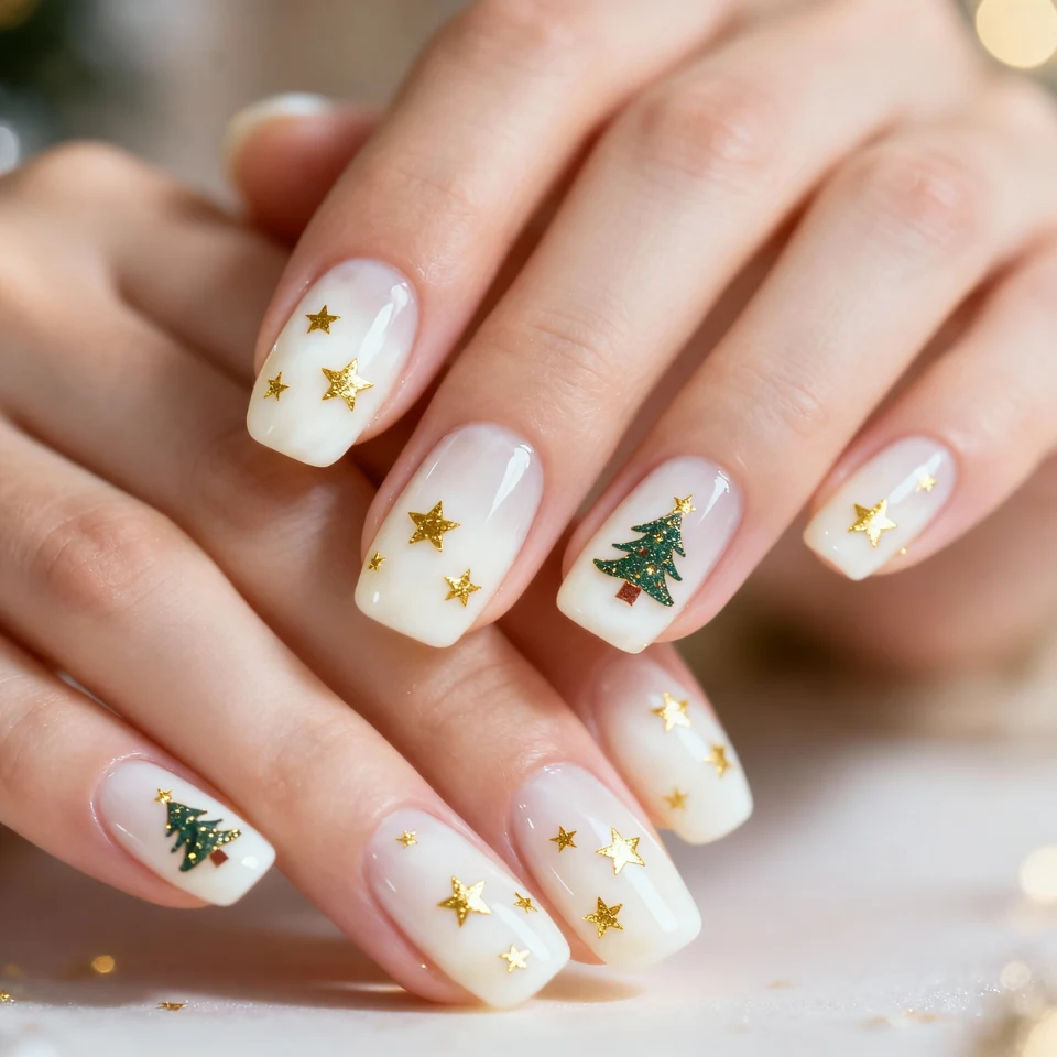 Milky white nails are a favorite for minimalist lovers, and adding tiny gold stars makes them holiday-ready. The soft base creates a dreamy look, while the gold adds a hint of luxury. This design feels light and elegant.