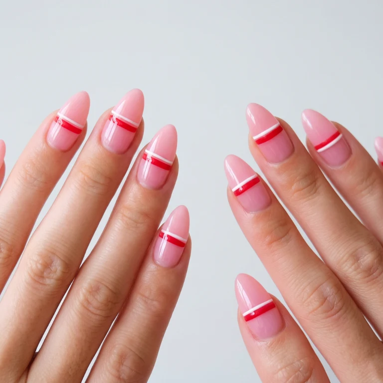A sheer pink base paired with a single red stripe creates a subtle candy cane effect. This design is minimal yet instantly recognizable as festive. It’s perfect for a soft and feminine holiday manicure.