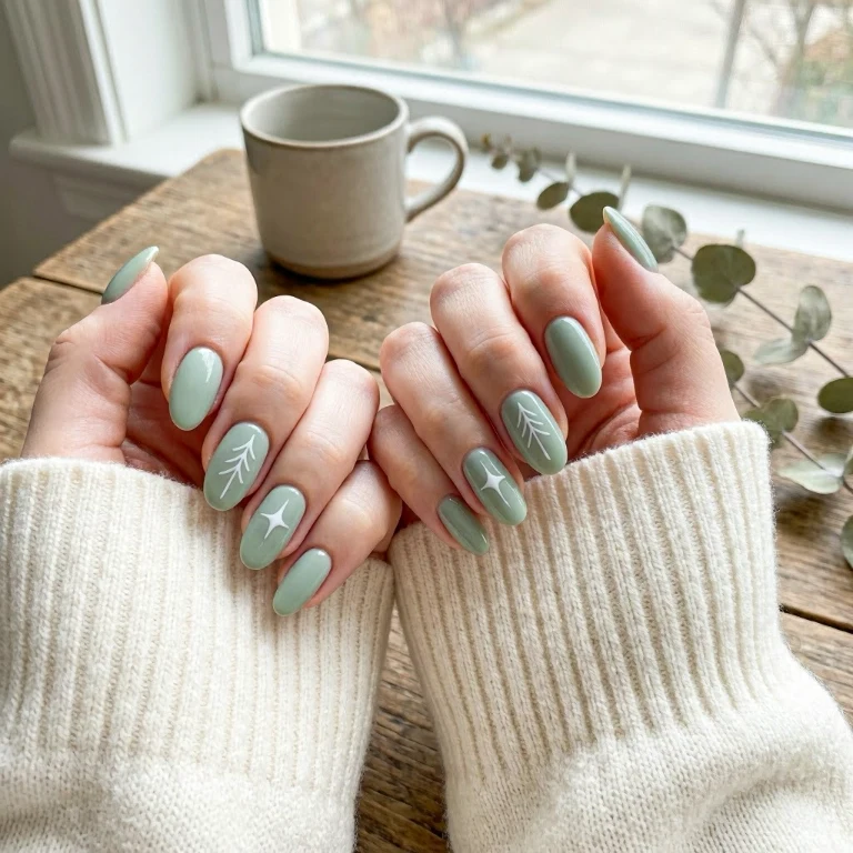 Soft green tones bring a natural holiday vibe to your nails. Adding thin white lines keeps the design clean and minimal while hinting at festive patterns. This look feels fresh and modern.