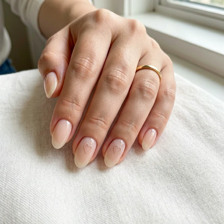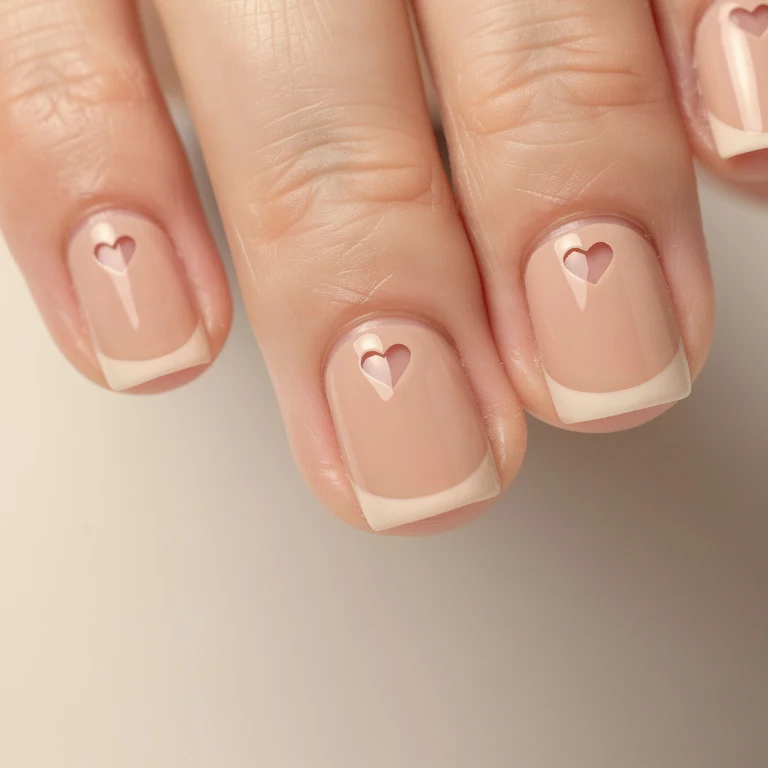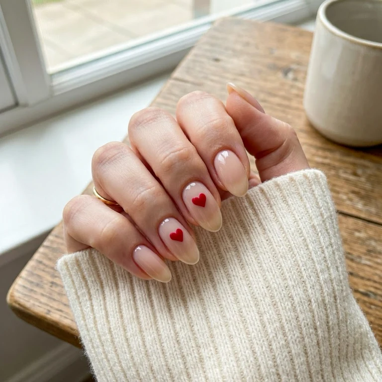 Placing tiny hearts near the cuticle creates a unique and subtle Valentine design. The nude base keeps the look clean, while the small heart detail adds a romantic touch.