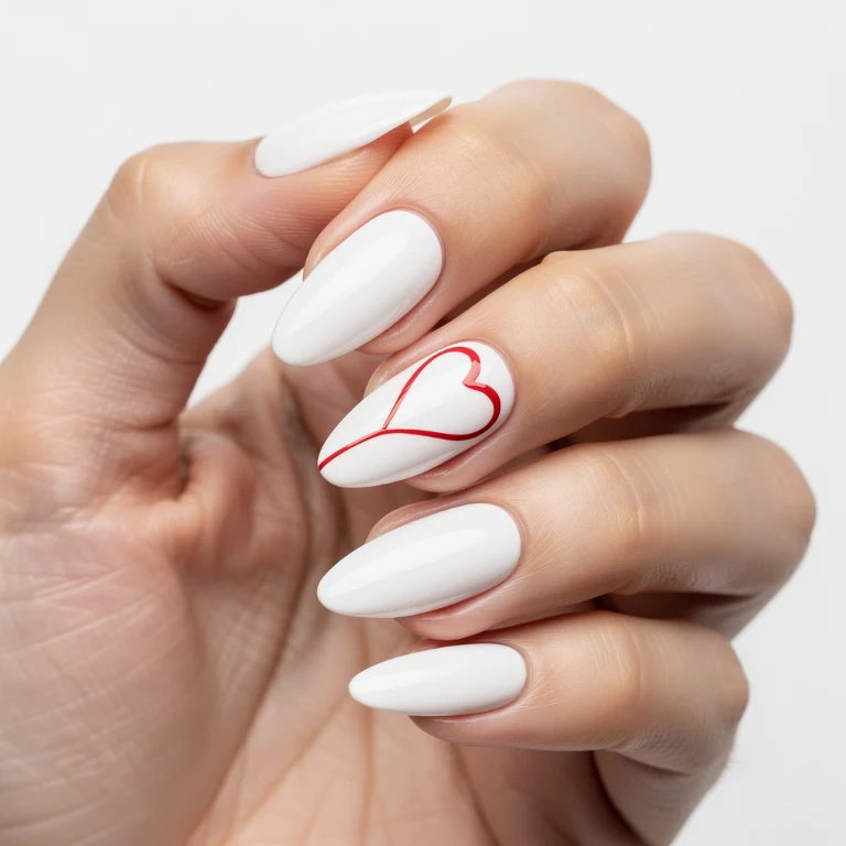 White nails offer a crisp and clean canvas for minimalist designs. Adding a thin heart line detail creates a subtle Valentine’s theme without overwhelming the look. It’s simple, modern, and very chic.