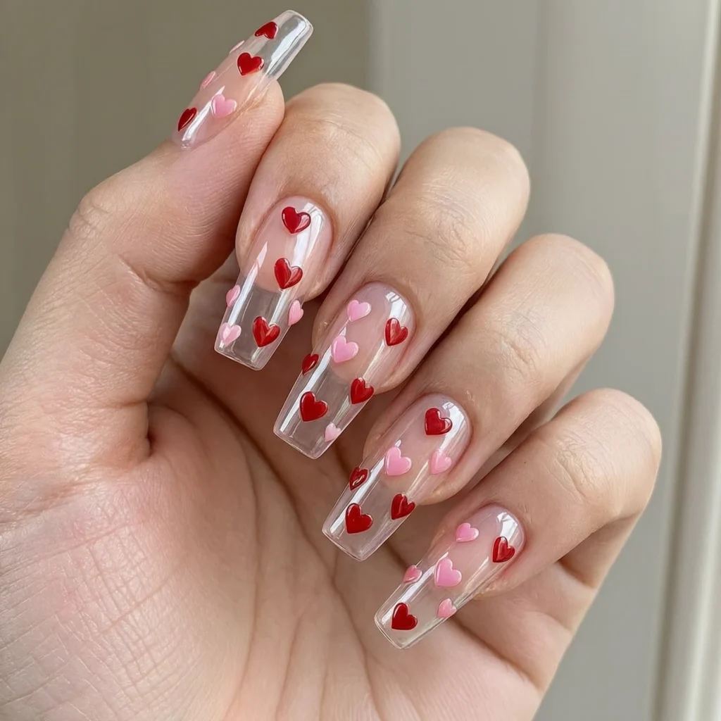 Clear nails with tiny floating hearts create a dreamy and modern Valentine aesthetic. The transparent base keeps the look light and airy while allowing the heart details to stand out beautifully. It’s minimal but still visually interesting.