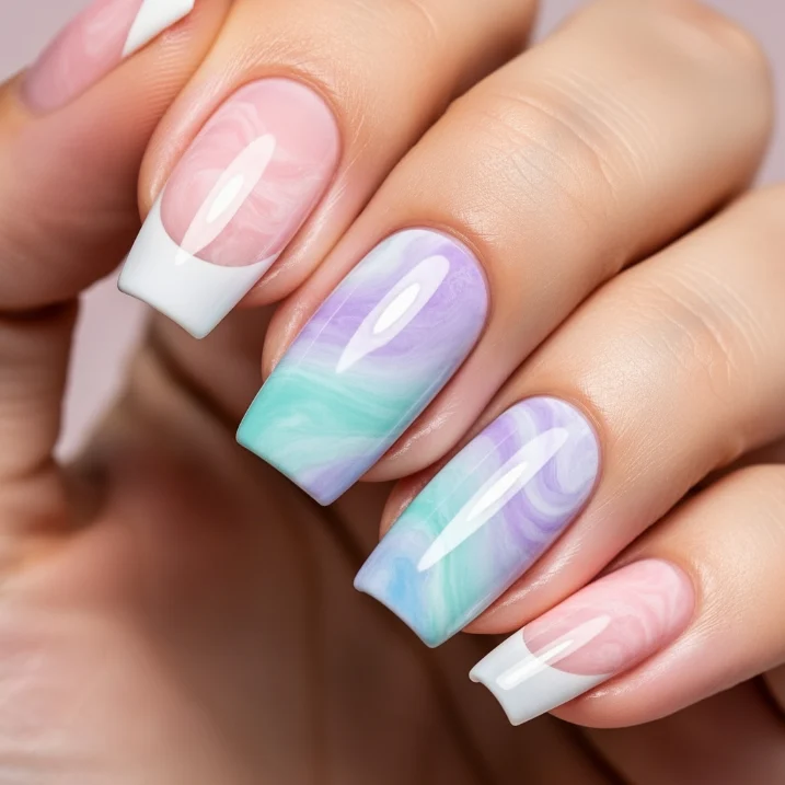 Marble French tips offer a sophisticated and artistic look. The swirling patterns create a unique design that feels both elegant and modern. It’s perfect for those who want something different yet refined.