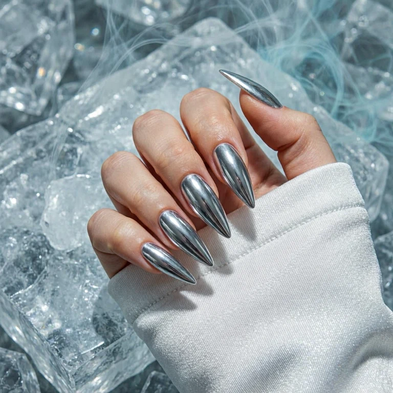 Frosted chrome nails are dominating winter 2025–2026 with their icy, mirror-like glow. This trend blends metallic shine with cool undertones like silver, blue, and lavender, creating a futuristic winter vibe. The reflective finish mimics frost on glass, making it perfect for cold-weather aesthetics and cozy seasonal outfits.