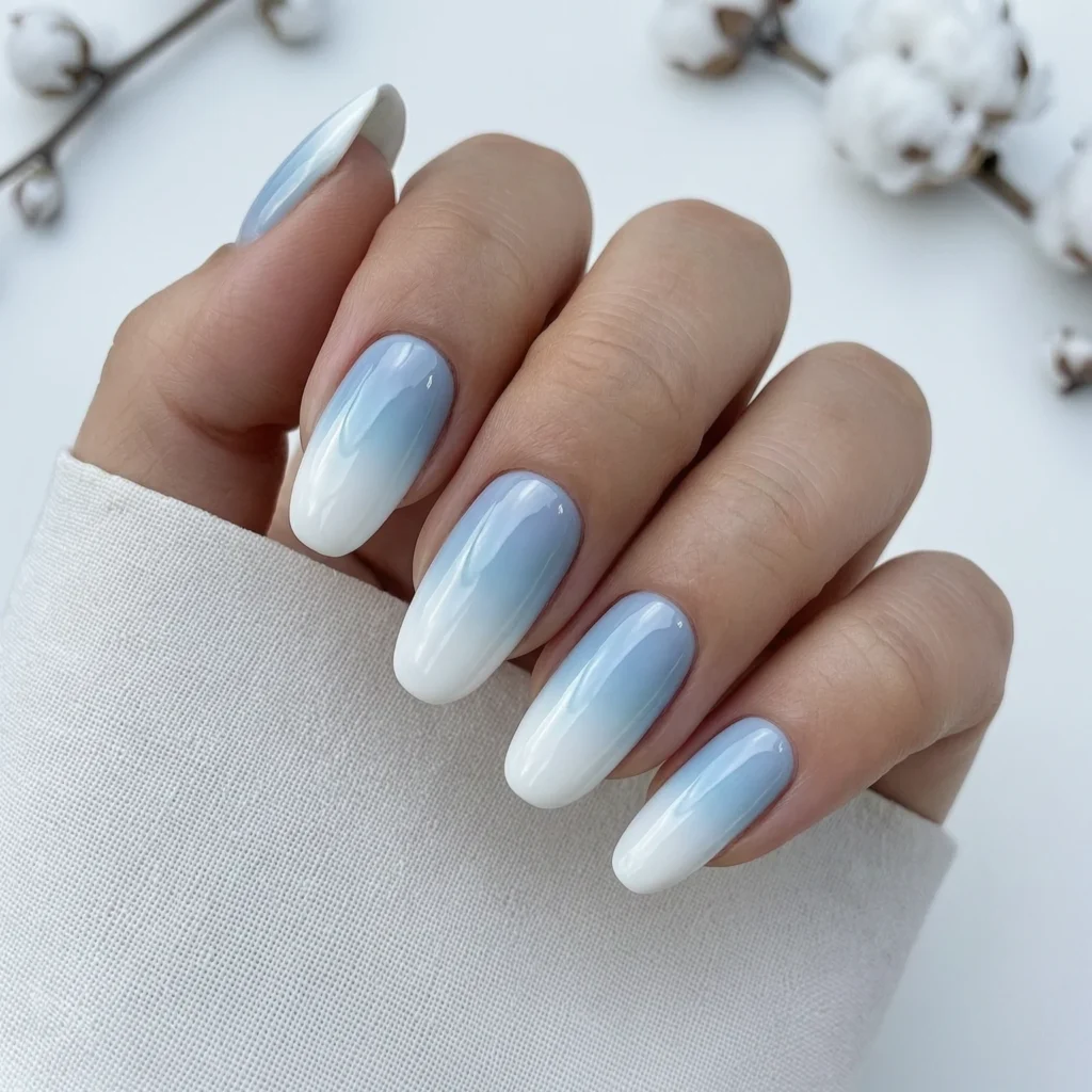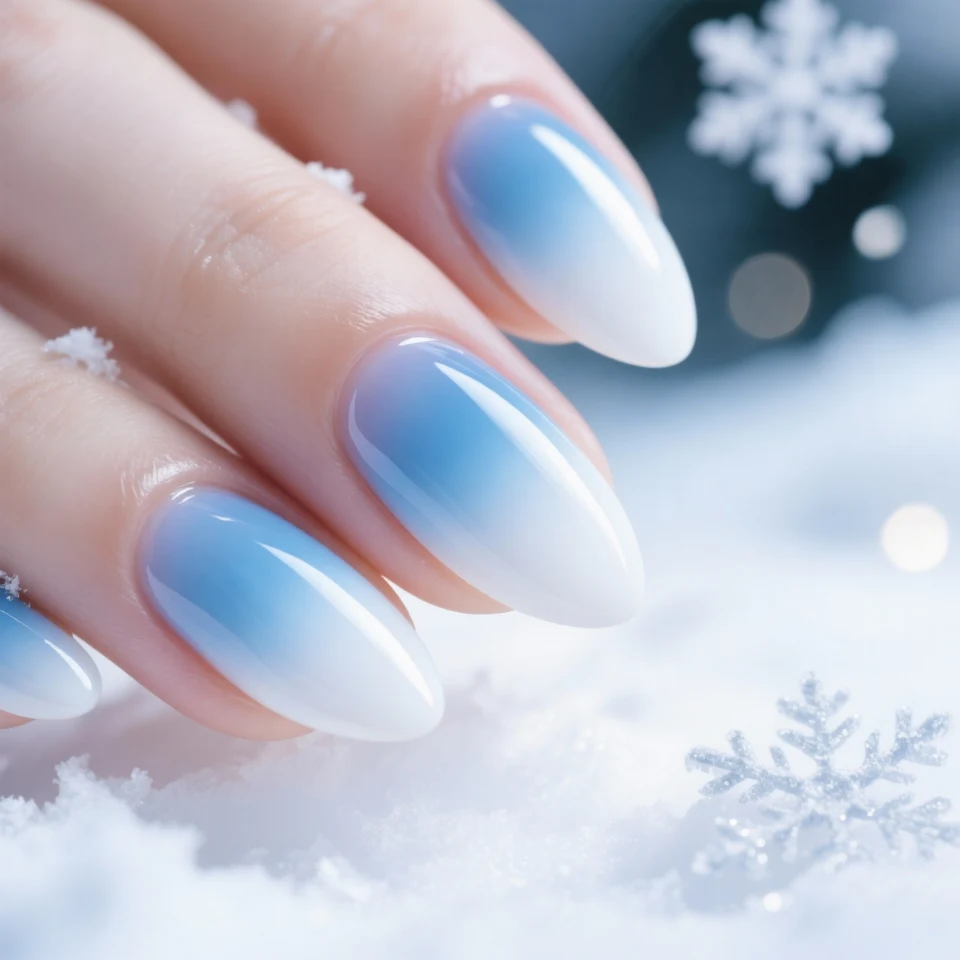 Ombre winter nails blend soft seasonal colors into a seamless gradient. Shades like icy blue, white, and lavender create a dreamy, frosty effect.