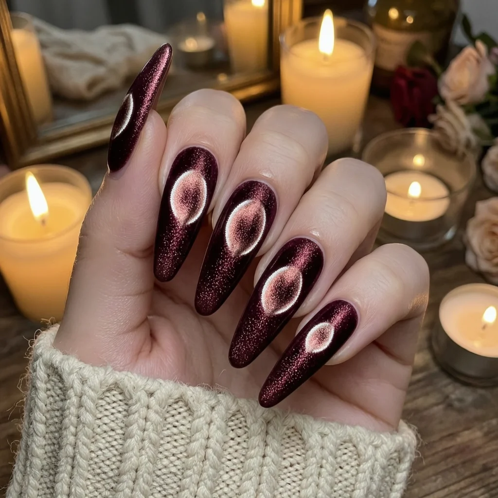 Velvet cat eye nails bring depth and richness to winter manicures with their magnetic shimmer effect. Shades like burgundy, emerald, and navy create a soft, glowing illusion that shifts in light, resembling plush velvet fabric. This trend feels luxurious and cozy at the same time.