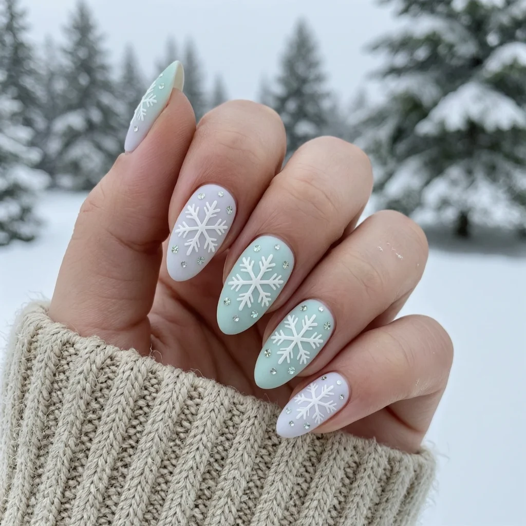 Snowflake nail art is a timeless winter favorite that returns every year with new variations. This season, designs are more intricate and delicate, often paired with soft pastel or nude bases for a dreamy effect.