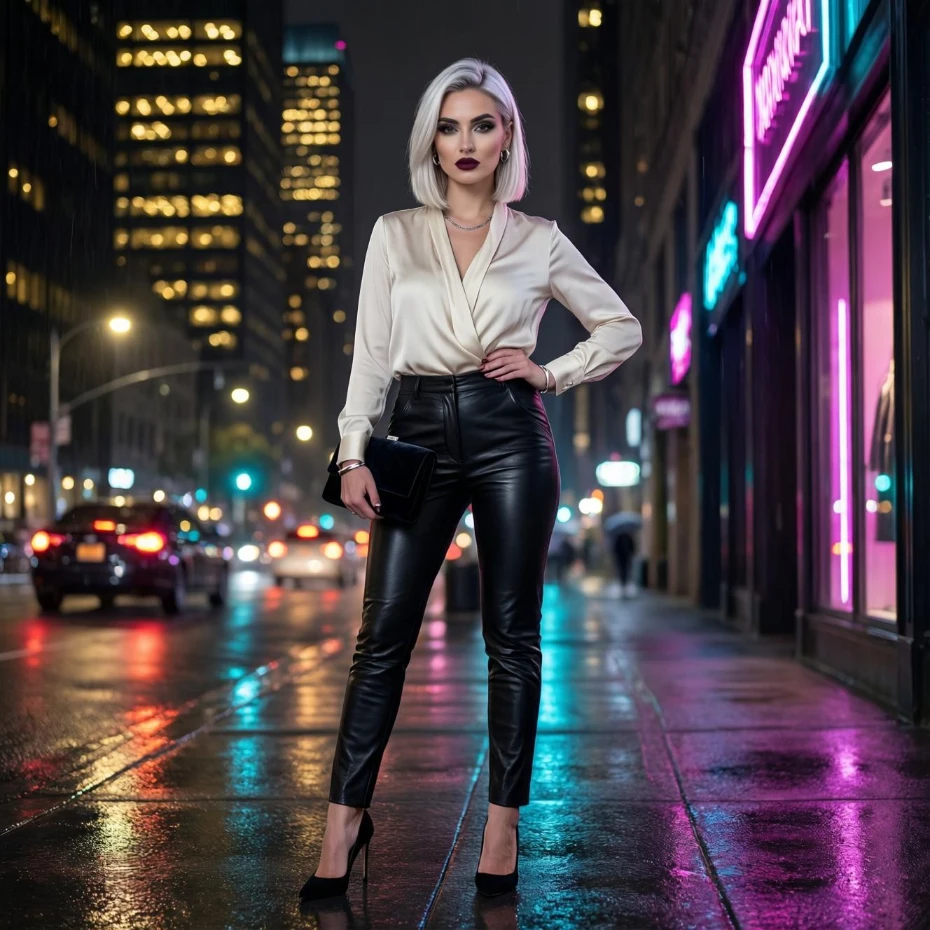 Leather pants paired with a soft blouse create a bold yet elegant outfit. The contrast between textures adds depth and interest.