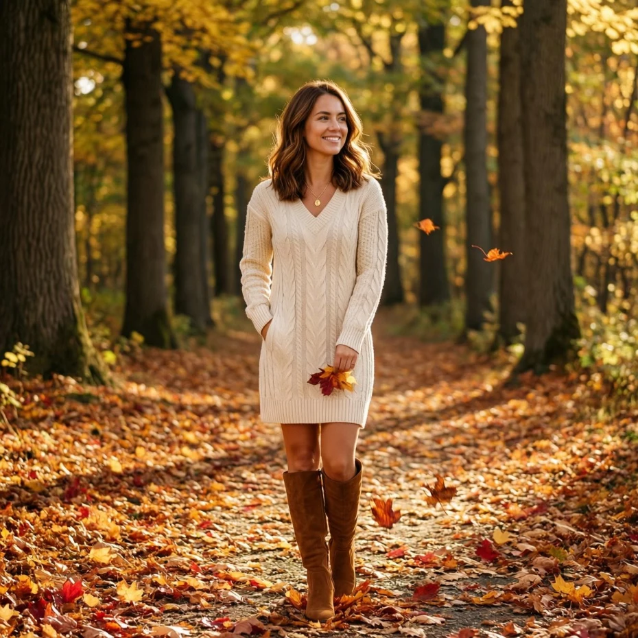 Add tights and knee-high boots to keep warm while maintaining elegance. Choose earthy tones to enhance the autumn feel. This outfit is great for daytime dates or casual dinners.