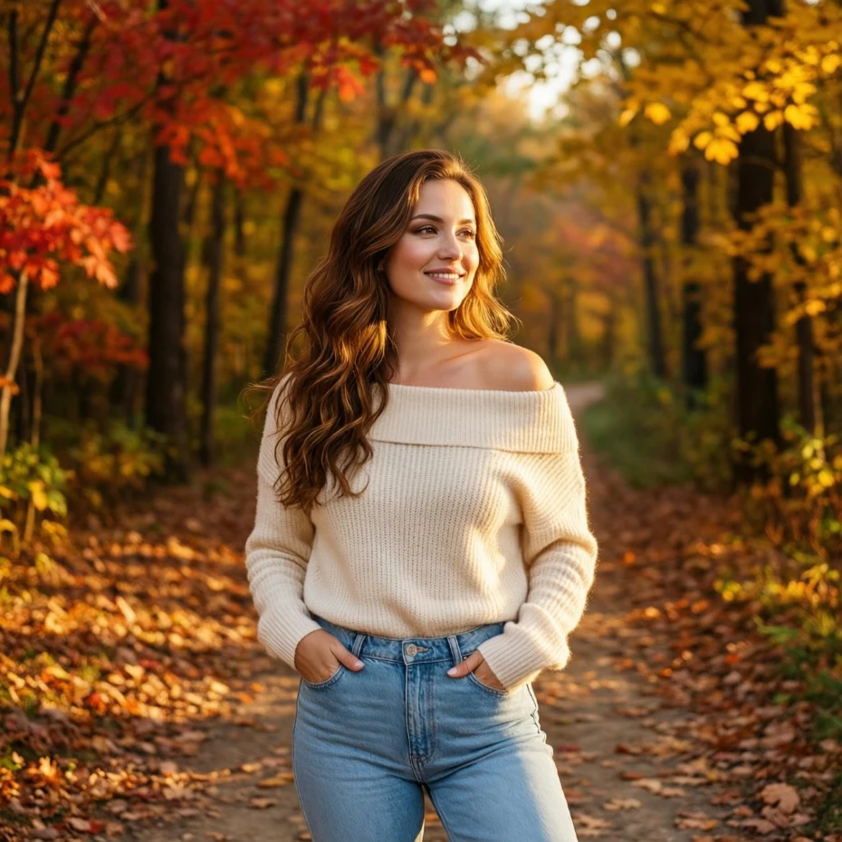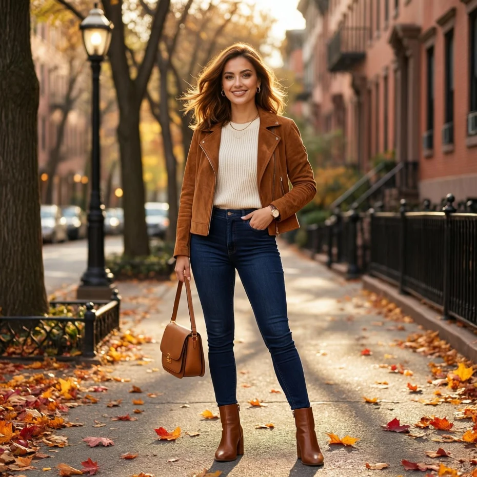 Choose fitted or straight-leg jeans for a flattering shape and pair them with heeled boots or strappy heels. Soft curls and delicate jewelry complete the look beautifully. This outfit works best for casual dinners, movie dates, or evening strolls.